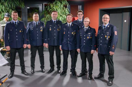 Stv. Kommandant Michael Schwarz, stv. Kommandant Thomas Sladky, stv. Vorstand Rainer Burkhard (Beförderung zum Oberlöschmeister), Peter Trottmann (Beförderung zum Oberfeuerwehrmann), Frederik Römer (Ehrung 10 Jahre), Stefan Bäuml (Beförderung zum Löschmeister), Kommandant Matthias Haulena