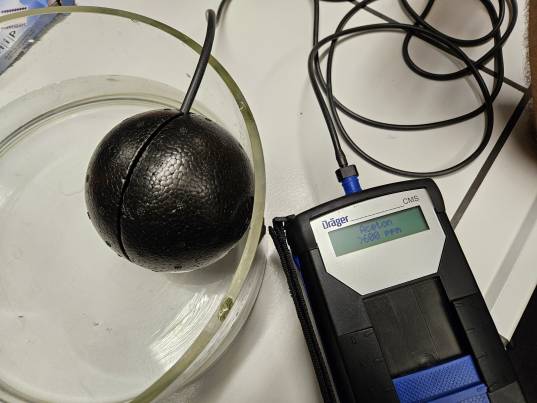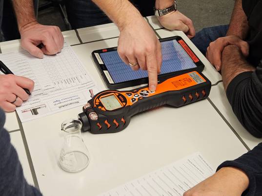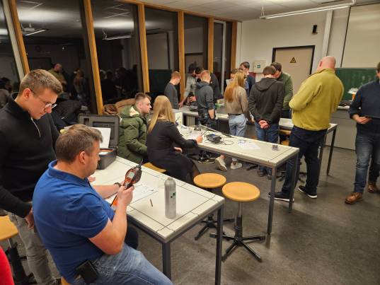 Im nun folgenden Praxisteil wurden 8 verschiedene Versuche aufgebaut, welche in Gruppen von 2-3 Kameraden der Reihe nach abgearbeitet werden konnten. Neben dem Nachweis zum Vorhandensein diverser Stoffe wurden auch Sonderfälle wie die Konzentrationsmessung eines auf der Wasseroberfläche abgesetzten Gases beübt. Weitere Stationen waren unter anderem der Nachweis von Wasser in einem Stoffgemisch mittels Wassernachweispaste, der Umgang mit Ölnachweisstreifen, das Bestimmen eines pH-Werts sowie der Umgang mit unseren Mehrgasmessgeräten. Zudem wurden die Abläufe einer Messreihe sowie das Anfertigen eines dazugehörigen Protokolls behandelt.