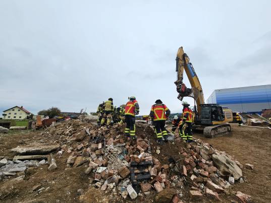 Unsere Kameraden kamen schließlich am Samstagvormittag, nachdem unser MTW als Führungsfahrzeug zu einem Erkundungseinsatz abgezogen wurde, mit beiden Fahrzeugen in Neuhof zum Einsatz. An der „Einsatzstelle“ mussten verschüttete Personen, teilweise unter Zuhilfenahme von schweren Gerät der Firma Plannerer, aus den Trümmern eines eingestürzten Gebäudes gerettet werden.