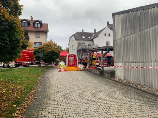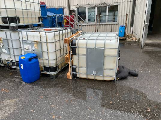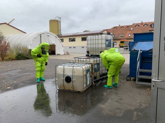 Bei Arbeiten mit einem Gabelstapler kam es zu einem Unglück, wobei eine Person unter einen mit Schwefelsäure gefüllten IBC-Container eingeklemmt und der Behälter beschädigt wurde. Ein mit Chemikalienschutzanzügen ausgerüsteter Trupp befreite schnellstmöglich den „Verletzten“ mit dem Rettungsspreizer und verschloss mit Hilfe weiterer Trupps den Behälter. Die Dekontamination der eingesetzten Kräfte wurde hierbei durch die Feuerwehr Mitterteich durchgeführt.