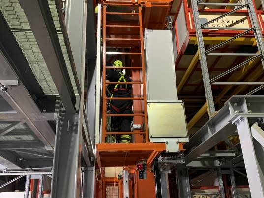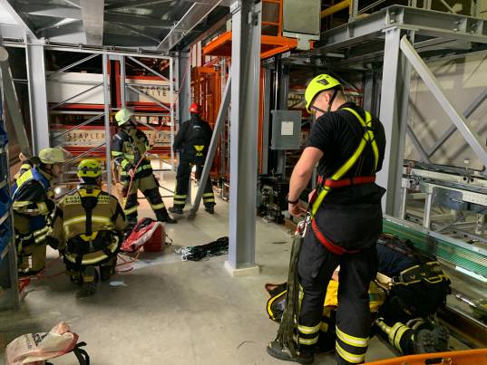 Parallel zur Gefahrgut-Lage kam es im Hochregallager zum Absturz eines Arbeiters, welcher unter Einsatz des Absturzsicherungssatzes aus seiner misslichen Lage befreit werden konnte.