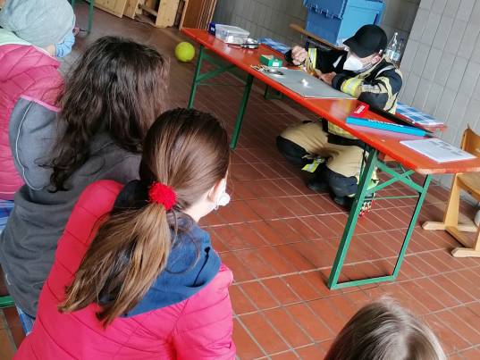 „Besondere Zeiten erfordern auch besondere Maßnahmen“, auch dies galt bei der jährlichen Vorstellung der Freiwilligen Feuerwehr an der örtlichen Grundschule. Anstelle des gewohnten Empfangs am Gerätehaus statteten diesmal vier aktive Feuerwehrdienstleistende Mitte Mai den Schülerinnen und Schülern der 3. Klasse unter Einhaltung der geltenden Hygieneschutzmaßnahmen an zwei Freitagen einen Besuch ab. Mit im Gepäck hatten diese nicht nur eines ihrer Löschfahrzeuge und dessen zahlreiche Ausrüstung, sondern auch die nagelneue Drehleiter. Zu Beginn des Besuchs wurde neben den Aufgaben der Feuerwehr auch auf das Thema Notruf mit den 5 W-Fragen sowie auf den Ablauf einer Alarmierung mittels Funkmeldeempfänger durch den Kommandanten Matthias Haulena eingegangen.