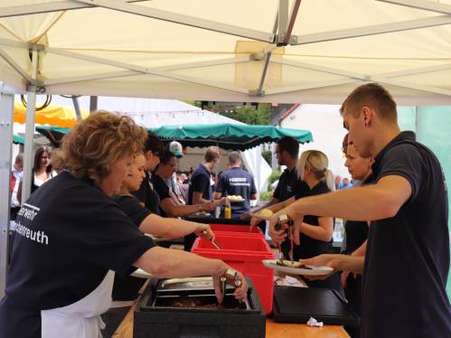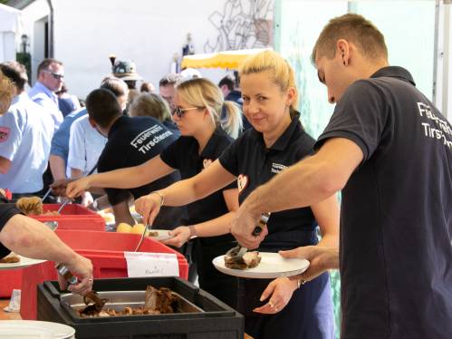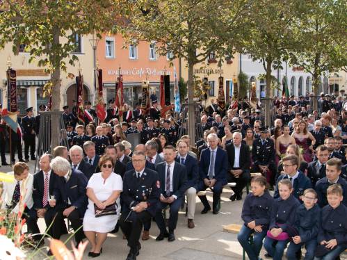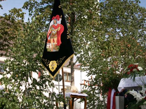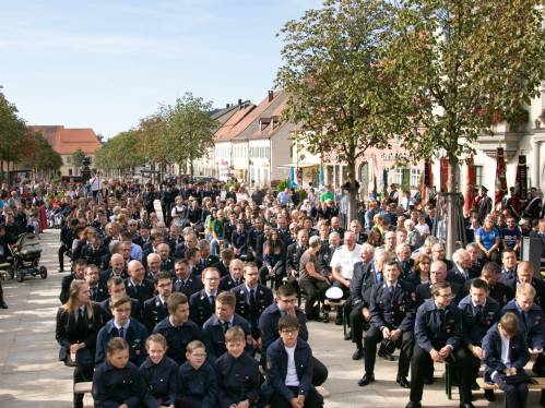 Am nächsten Morgen begann der letzte Festakt mit einem kleinen Kirchenzug vom Gerätehaus zum Marktplatz. Dort aufgestellt wurde unsere neue Vereinsfahne im Rahmen eines großen Festgottesdienstes geweiht. Im Anschluss daran versorgten wir unsere Gäste mittags traditionell mit Schweinebrate und den Ausklang der Feier bildete dann ein Fest bis in die späten Abendstunden.