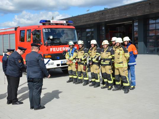 Im Anschluss an die Wertungsdurchgänge wurden im Gerätehaus durch die anwesenden Wertungsrichter KBM Frank Roland, KBM Harald Würner und KBI Klaus Schicker sowie die Kommandanten Matthias Haulena, Thomas Sladky und Thomas Keller die Abzeichen in allen Stufen sowie das gesonderte Abzeichen für die Ü40-Teilnehmer überreicht.