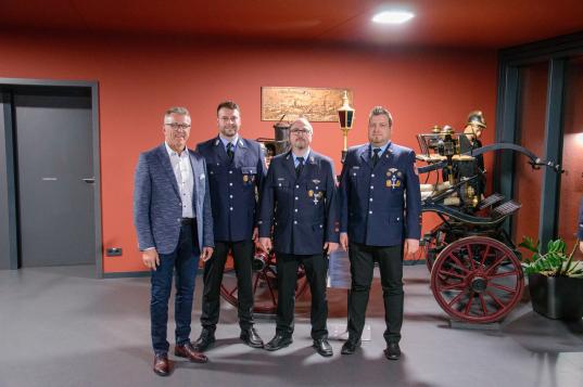 Erster Bürgermeister Franz Stahl, stv. Kommandant Michael Schwarz, Erster Kommandant Matthias Haulena, stv. Kommandant Thomas Sladky