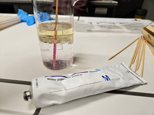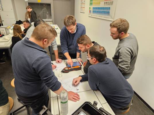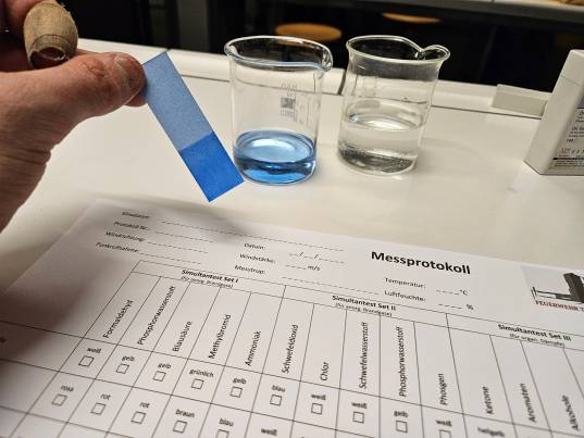 Im nun folgenden Praxisteil wurden 8 verschiedene Versuche aufgebaut, welche in Gruppen von 2-3 Kameraden der Reihe nach abgearbeitet werden konnten. Neben dem Nachweis zum Vorhandensein diverser Stoffe wurden auch Sonderfälle wie die Konzentrationsmessung eines auf der Wasseroberfläche abgesetzten Gases beübt. Weitere Stationen waren unter anderem der Nachweis von Wasser in einem Stoffgemisch mittels Wassernachweispaste, der Umgang mit Ölnachweisstreifen, das Bestimmen eines pH-Werts sowie der Umgang mit unseren Mehrgasmessgeräten. Zudem wurden die Abläufe einer Messreihe sowie das Anfertigen eines dazugehörigen Protokolls behandelt.