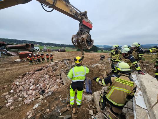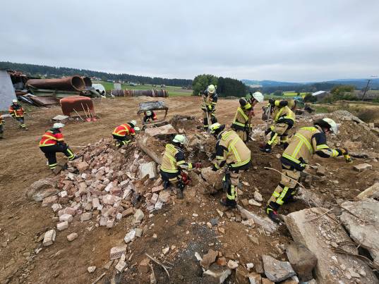 Unsere Kameraden kamen schließlich am Samstagvormittag, nachdem unser MTW als Führungsfahrzeug zu einem Erkundungseinsatz abgezogen wurde, mit beiden Fahrzeugen in Neuhof zum Einsatz. An der „Einsatzstelle“ mussten verschüttete Personen, teilweise unter Zuhilfenahme von schweren Gerät der Firma Plannerer, aus den Trümmern eines eingestürzten Gebäudes gerettet werden.
