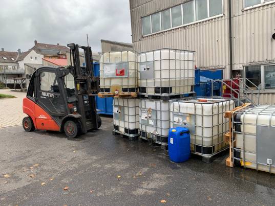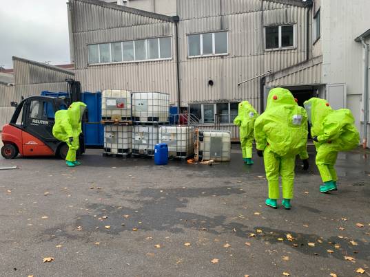 Bei Arbeiten mit einem Gabelstapler kam es zu einem Unglück, wobei eine Person unter einen mit Schwefelsäure gefüllten IBC-Container eingeklemmt und der Behälter beschädigt wurde. Ein mit Chemikalienschutzanzügen ausgerüsteter Trupp befreite schnellstmöglich den „Verletzten“ mit dem Rettungsspreizer und verschloss mit Hilfe weiterer Trupps den Behälter. Die Dekontamination der eingesetzten Kräfte wurde hierbei durch die Feuerwehr Mitterteich durchgeführt.