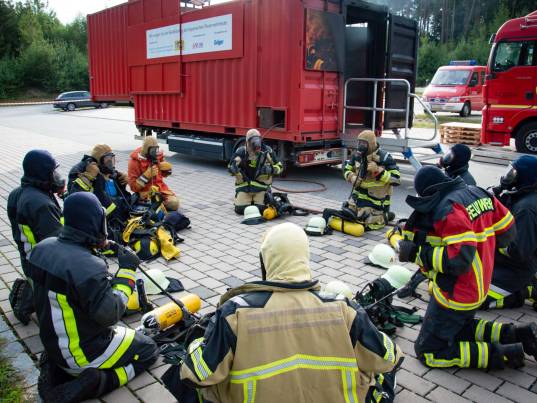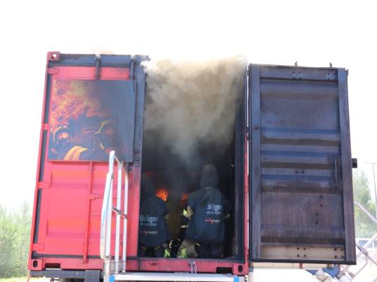 Auf dem Parkplatz der Firma Hamm wurde im "Fire Dragon", einen Brandübungscontainer der Firma Dräger in Kooperation mit dem Landesfeuerwehrverband Bayern und der Firma Securitas.