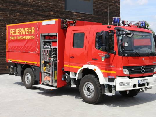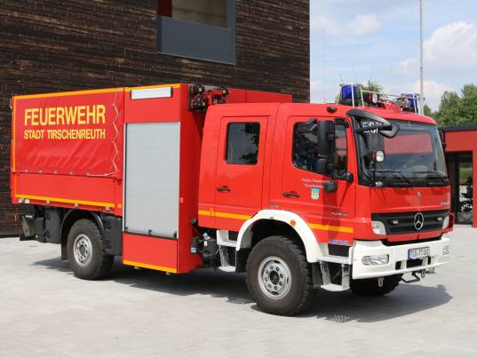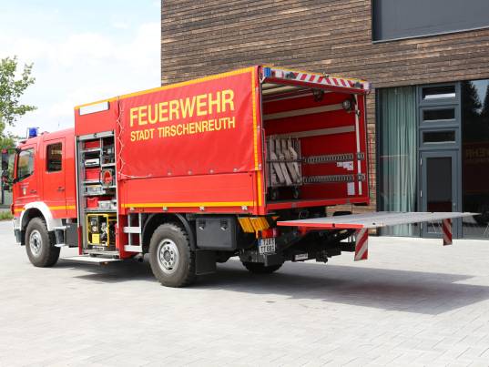 Hinter den seitlichen Rollos verbirgt sich Material zur Verkehrsabsicherung, ein Stromerzeuger, eine Motorsäge, Scheinwerfer und Stativ sowie zwei Tauchpumpen. Auch Armaturen und Gerätschaften zur Wasserentnahme, -fortleitung und -abgabe sind darin untergebracht.