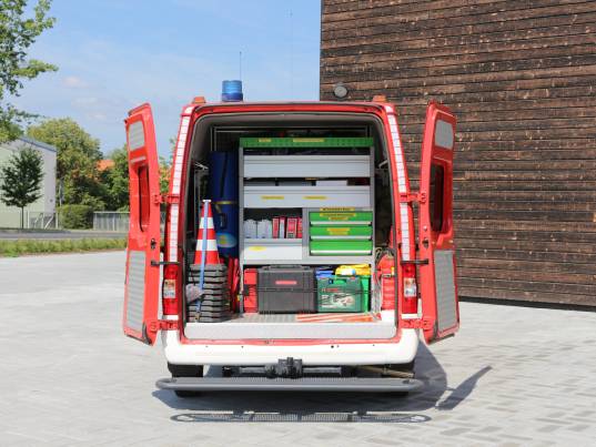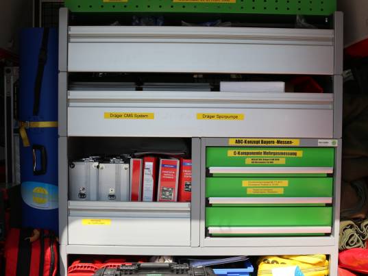 Untergebracht sind Kartenmaterial, ein Notfallrucksack, Scheinwerfer, Absperrmaterial, Handwerkzeug und verschiedene Messgeräte.