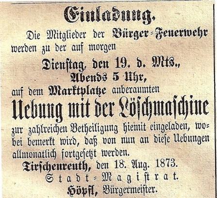 „Einladung. Die Mitglieder der Bürger-Feuerwehr werden zu der auf morgen Dienstag, 19. des Monats, Abends 5 Uhr, auf dem Marktplatze anberaumten Uebung mit der Löschmaschine zur zahlreichen Betheiligung hiermit eingeladen, wobei bemerkt wird, daß von nun an diese Uebungen allmonatlich fortgesetzt werden. Tirschenreuth, den 18. August 1973. Stadt Magistrat Höpfl, Bürgermeister.“