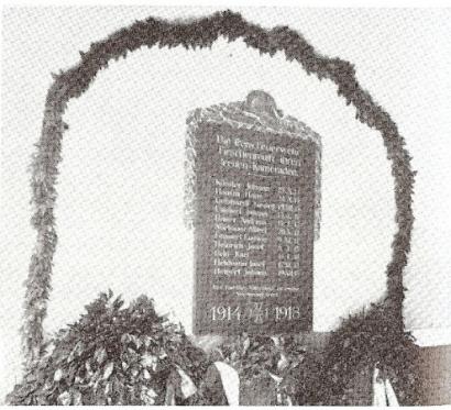 Anlässlich der Feier des 60-jährigen Bestehens gedachte die Wehr ihrer tapferen Kameraden des 1. Weltkriegs, die für die Verteidigung der Heimat ihr Leben geopfert hatten. Vorstand rechtskräftiger Bürgermeister Heinrich Mayer führte in seiner Ansprache aus, dass es die Wehr als ihre höchste Dankespflicht betrachte, an dem Jubeltage der gefallenen Wehrleute zu gedenken, die in der Mitte des Vereins ein leuchtendes Beispiel bleiben werden.